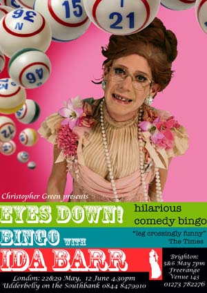 Skilled bingo caller Ida Barr, who instead of morosely looking back on her glory days as a music hall singer, is best known for her unique brand of "artificial hip hop". Ida returns to the UK with a new show where if you book early, you are in for a riot of Housey Housey, top quality prizes (courtesy of Pound stretcher), and gangsta grandma rap including Barr's new collaboration with Dizzee Rascal, "I'll Slap Yer Legs (And Tell Yer Mum)". A huge hit of several Brighton Festivals and last year's Udderbelly on the Southbank.
